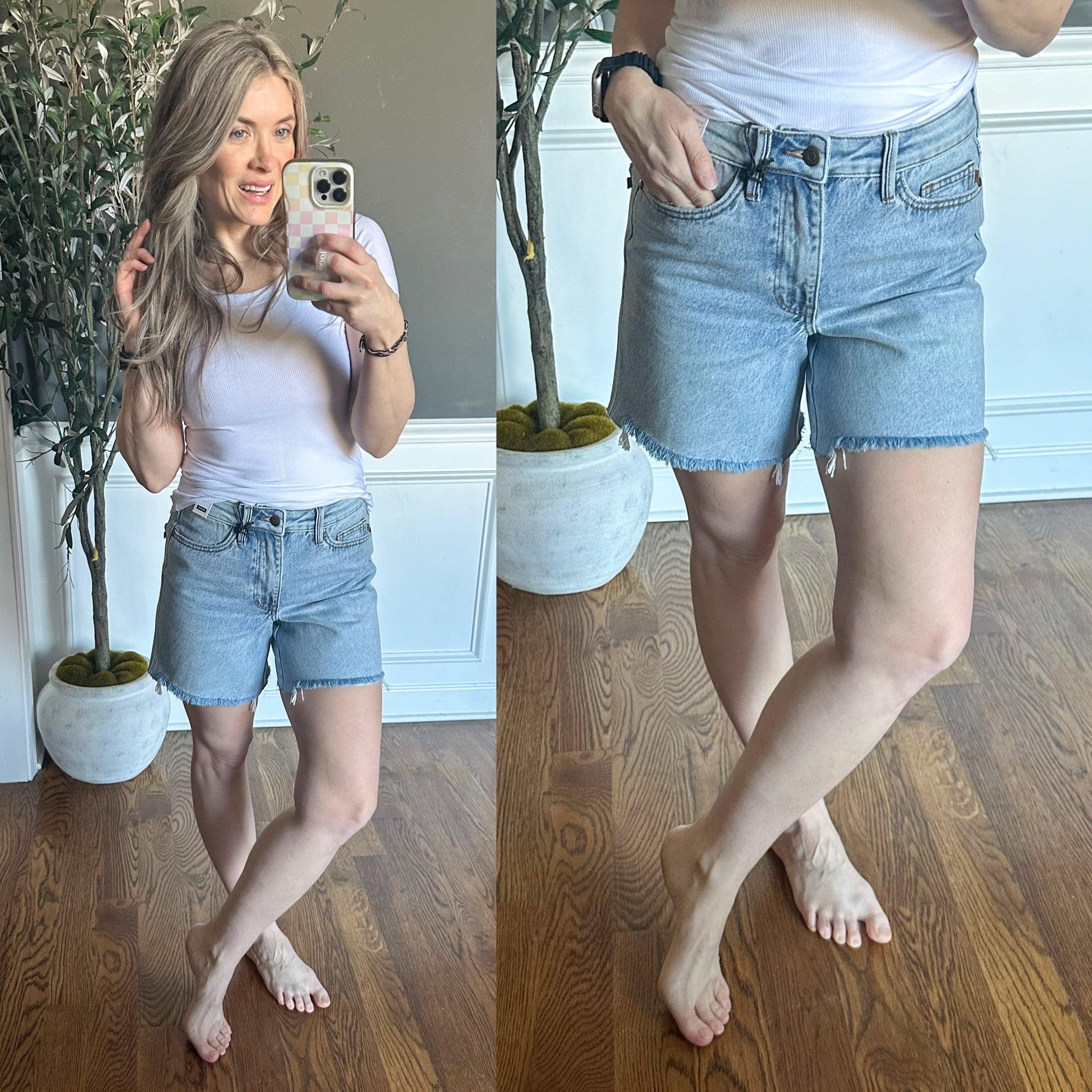 Introducing the Evelyn Mid Rise Rigid Magic Dad Shorts – your new go-to for effortless cool. Crafted by Judy Blue with a classic dad silhouette that's having a major moment, these shorts feature a comfortable mid-rise fit and trusty zipper fly. The 4-way stretch fabric moves with you, whether you're running errands or kicking back, while the distressed raw hem adds that perfectly worn-in vibe. Rigid magic construction keeps its shape, so you look put-together without trying too hard.