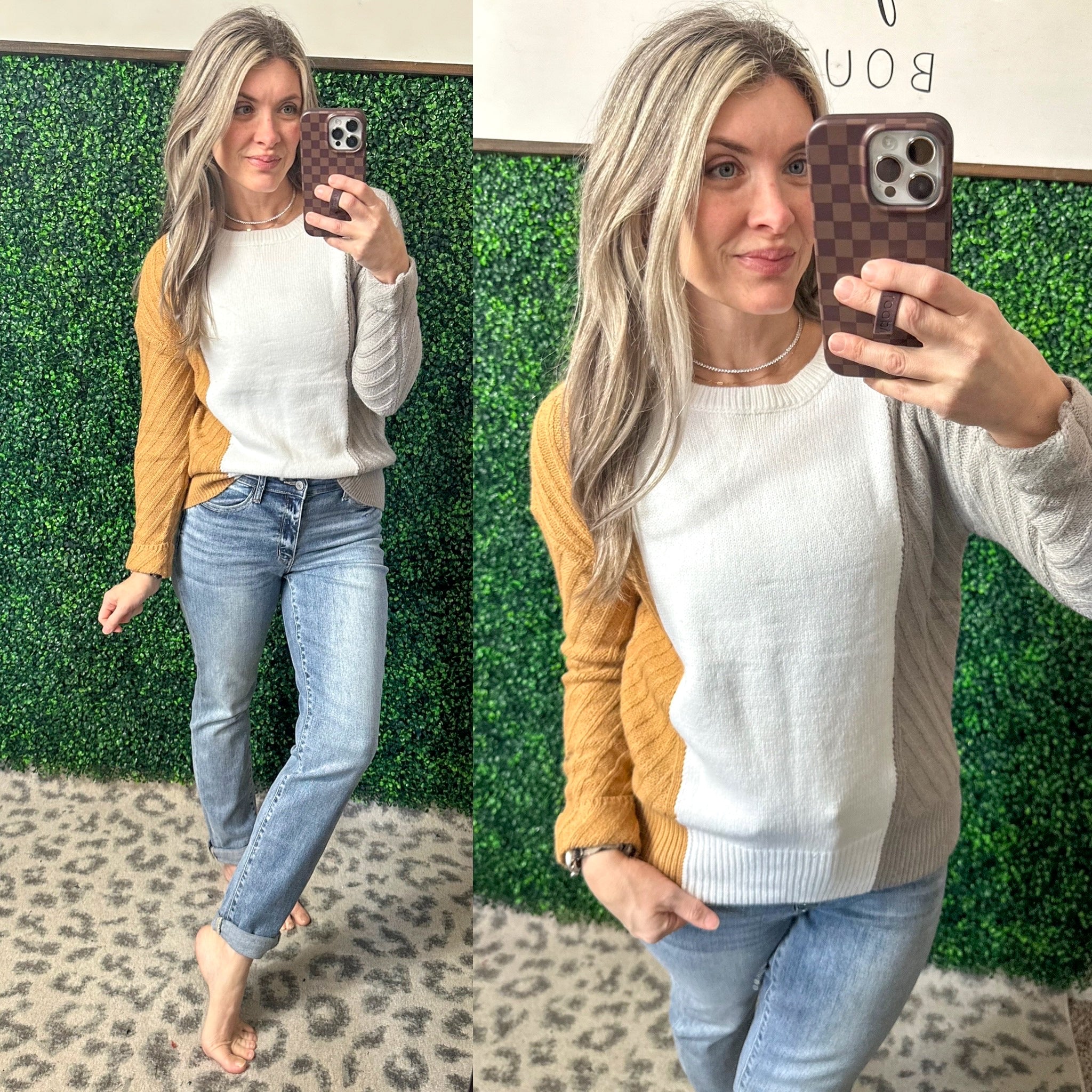 Stay on trend with our This, That, and the Other Color Block Sweater. This playful and lightweight sweater features a trio of colors and a unique asymmetrical stepped hem. Perfect for infusing a laidback vibe to any outfit, this sweater is a must-have for the season.