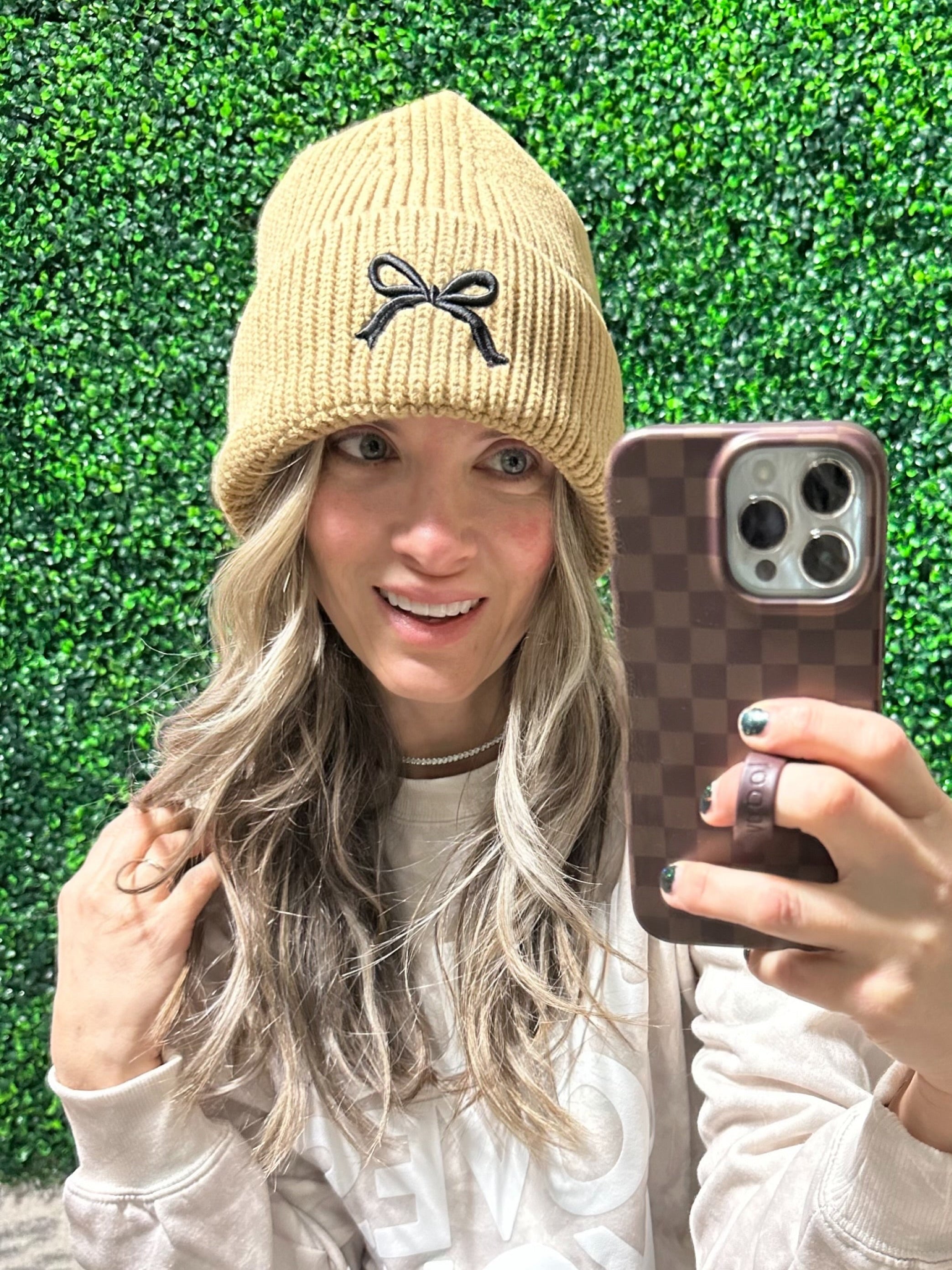 Knit Bow Beanie in Tan
