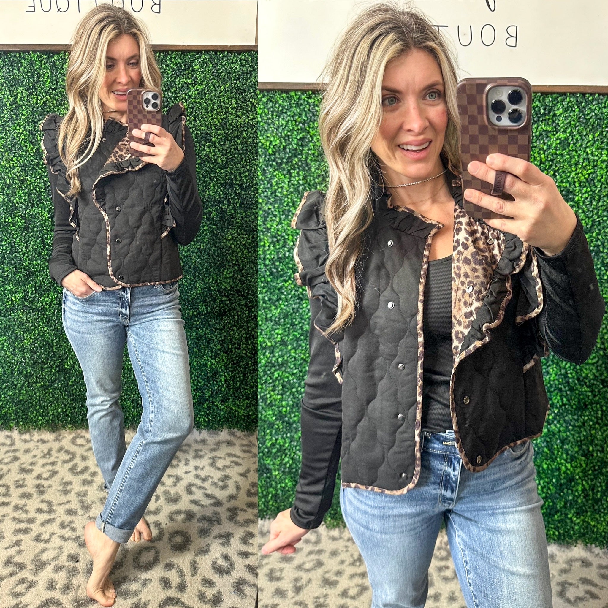 Leopard and Ruffle Quilted Puffer Vest in Black