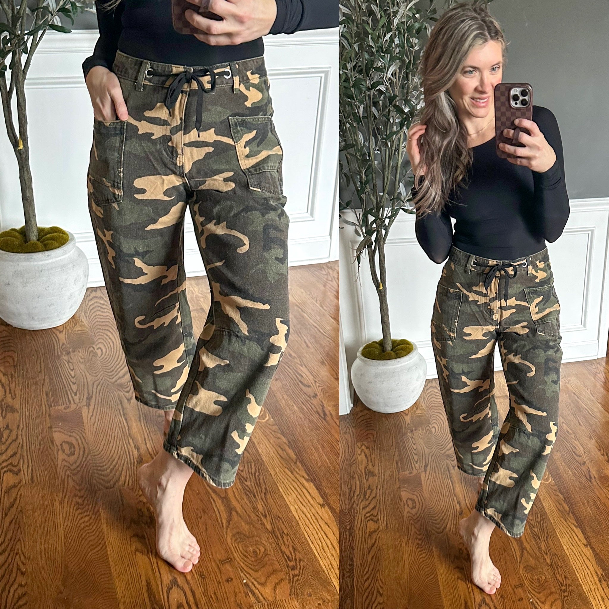 The Now You See Me Camo Cargo Pants deliver style with a wink and a nod. Built from durable twill with a flattering mid-rise fit, these pants feature a relaxed wide-leg silhouette that's both comfortable and on-trend. A functional drawstring lets you dial in the perfect fit, while generous patch pockets give you storage space without the fuss. Perfect for those days when you want to blend in—or stand out—with effortless cool.