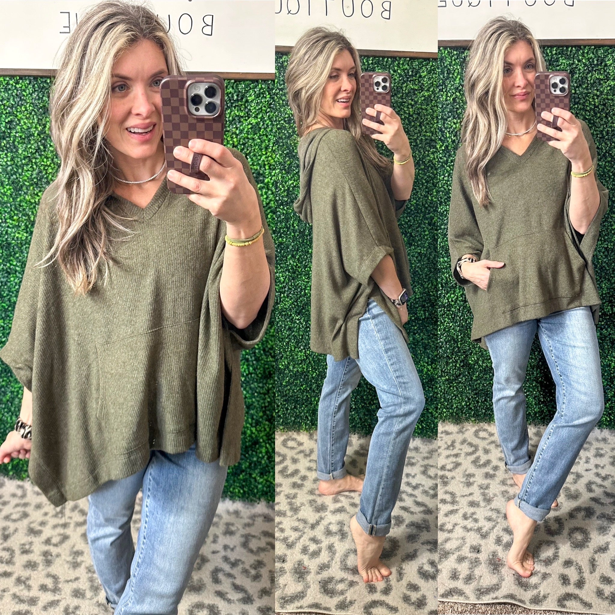 Achieve impeccable style and comfort in our Perfectly Poised Hooded Poncho. Crafted from lightweight ribbed jersey knit in a poncho-style, this piece features a hood and kangaroo pocket for ultimate warmth and coziness. Feel poised, put-together, and stylish - no matter what the day brings!